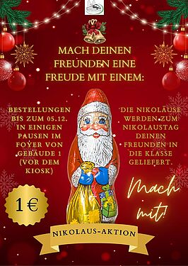 1 € für den Kauf eines Nikolaus' waren gut investiert, um Mitschülerinnen und Mitschülern sowie allen anderen des Schulpersonals zum Nikolaustag eine kleine Überraschung bereiten zu können. Knapp zwei Wochen lang war im Vorfeld des heutigen Tages Zeit, im Foyer der Schule Schoko-Nikoläuse zu bestellen. Viele nahmen die Gelegenheit gerne wahr, liebgewonnenen Menschen damit eine Freude zu machen.