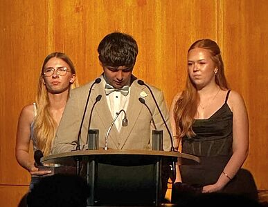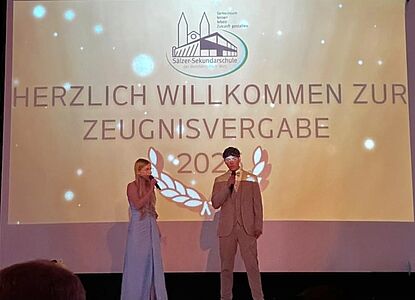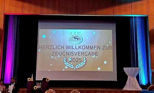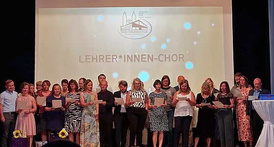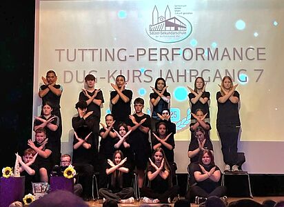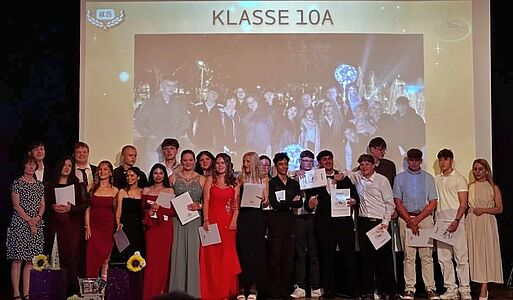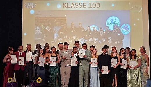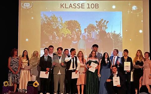 Umrahmt wurde die Überreichung der Abschlusszeugnisse von verschiedenen Performances der DuG-Kurse der Jahrgänge 7 und 8, bevor der LehrerInnen-Chor sich mit einem eigens umgedichteten Text zum Song "Mamma Mia" von Abba auf humorvoll-schwungvolle Weise vom Abschlussjahrgang verabschiedete. Mit einem Mashup-Video blickte der Jahrgang nochmals zurück auf sechs bewegte Schuljahre, die in Erinnerung bleiben werden.