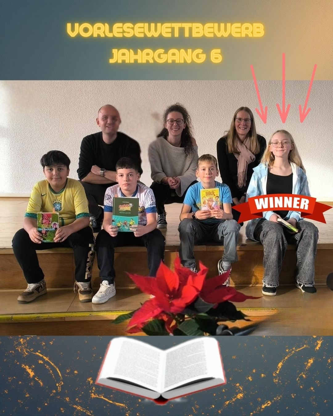 Die Jury, zu der Frau Wullkopf von der Buchhandlung Stein, Herr Vorderwülbecke von der Stadtbücherei, Frau Drahtwa als unabhängige Deutschlehrerin, Daria als Siegerin des Vorjahreswettbewerbs und Lilly von der SV gehörten, machte sich die Entscheidung nicht leicht. Nach ausführlicher Diskussion ging dann schließlich Joliene aus der Klasse 6d mit ihrem Vortrag aus Gregs Tagebuch als Siegerin des diesjährigen Wettbewerbs hervor.